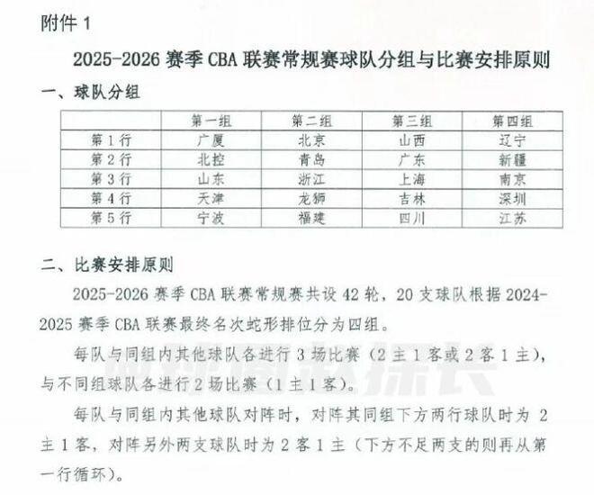 虽然新赛季的CBA联赛要等到12月开打,不过各项工作都在有序进行。据媒体人“球圈赵探长”透露,CBA公司已经将《2025-2026赛季CBA联赛常规赛分组与比赛安排原则》下发给了各队,来征求意见。在该文件中,明确了新赛季的分组情况,20支球队总共被分为四个小组,具体分组情况如下:
