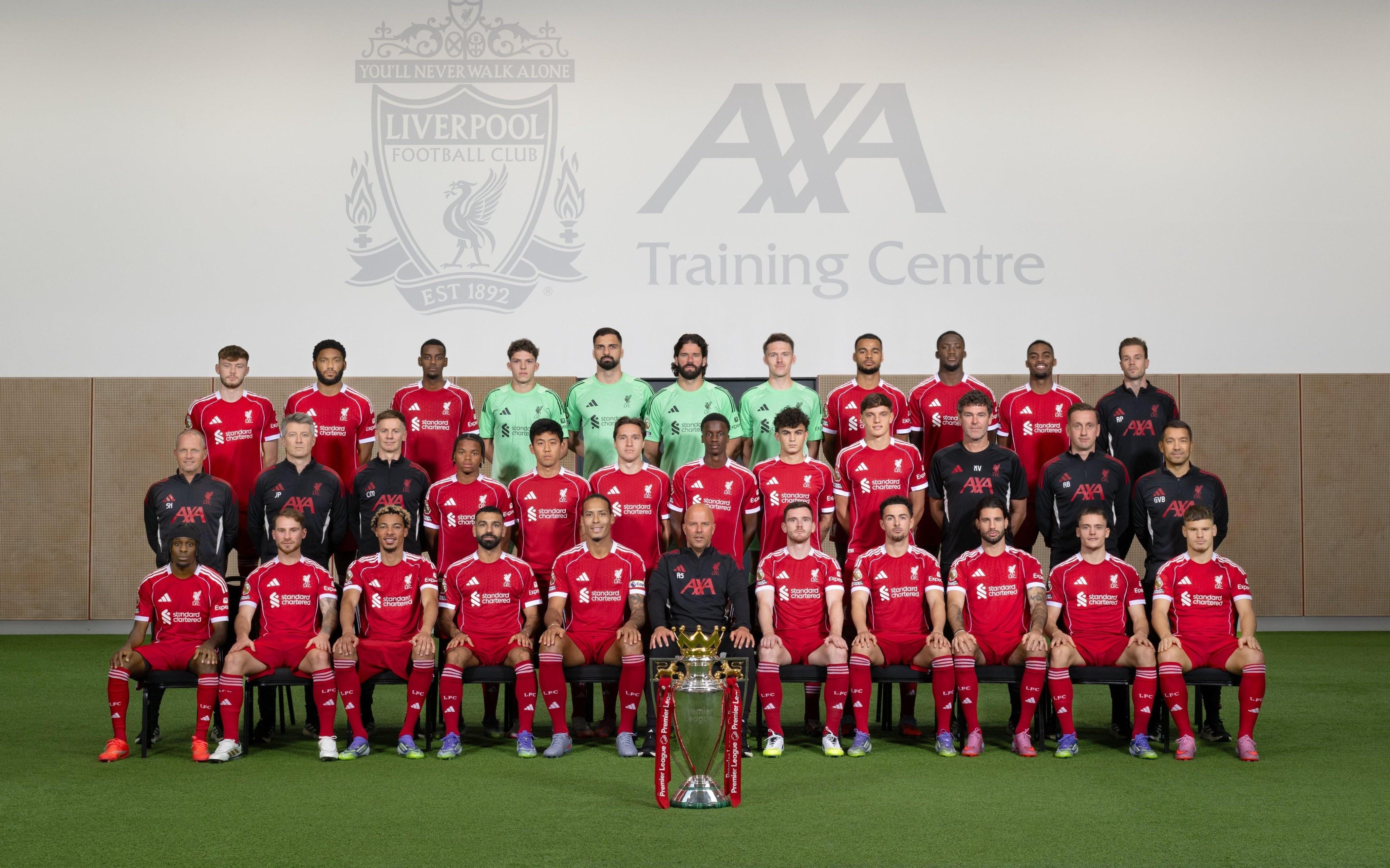 利物浦官方晒新赛季全家福:26名球员在列,前方为英超奖杯