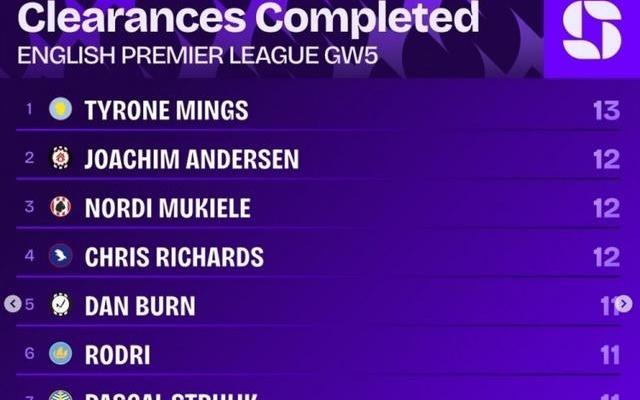 英超第5轮解围榜:明斯13次居首,约西姆安德森等三人12次第二
