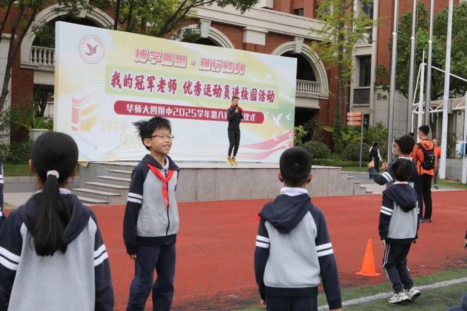 接着同学们来到报告厅,与陈老师开启了一次冠军课堂。华东师范大学第四附属中学党总支书记王萍深情寄语:“体育不仅是强身健体的手段,更是立德树人的载体。陈金洋老师带来的不仅是一堂课,更是一种信念的传递。”她勉励同学们以冠军为榜样,在奔跑中读懂坚持的意义,在汗水中感悟成长的力量,并强调学校始终坚持“健康第一”的教育理念,努力让每一个孩子都能在体育中找到属于自己的节奏与光芒。