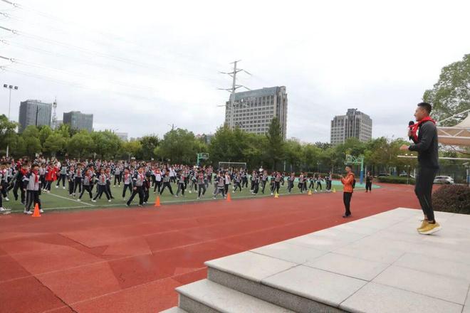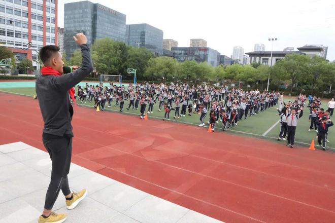 来到操场后,陈老师为500名学生在操场上带来了一节“冠军体育课”。课程分为三个阶段:热身、激活与专项训练。陈老师亲自带领大家进行膝关节环绕、韧带拉伸,细致讲解正确跑姿—“身体微微前倾,步幅适中,落地轻盈”。随后组织绕圈慢跑,在过程中不断纠正学生的动作,提醒节奏与呼吸的配合。最后,在体育老师的带领下,全体学生在操场上以班级为单位,集体跑操。操场上,脚步声与欢笑声交织,青春的身影在阳光下跃动。那一刻,体育不再是竞技场上的胜负,而是生命成长中最动人的旋律。