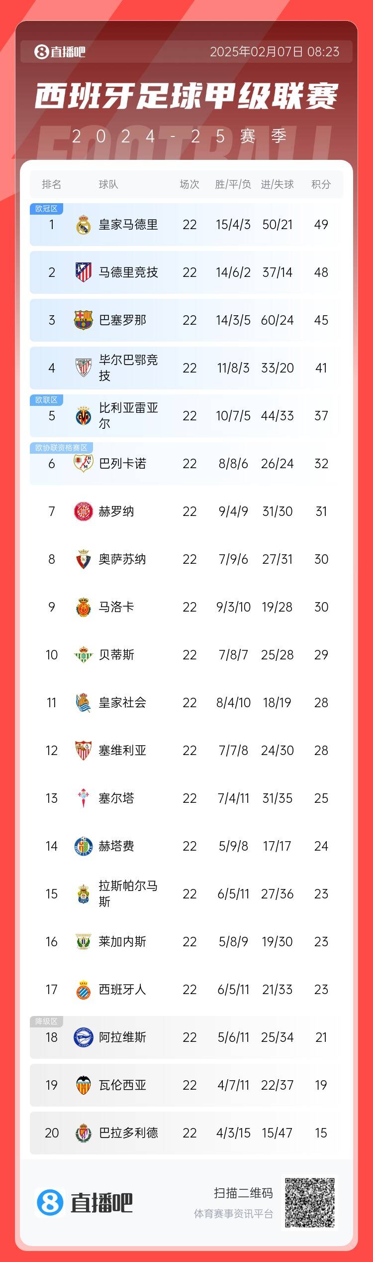 随着皇马21巴萨+贝林厄姆传射+姆巴佩破门!西甲积分榜马竞掉队