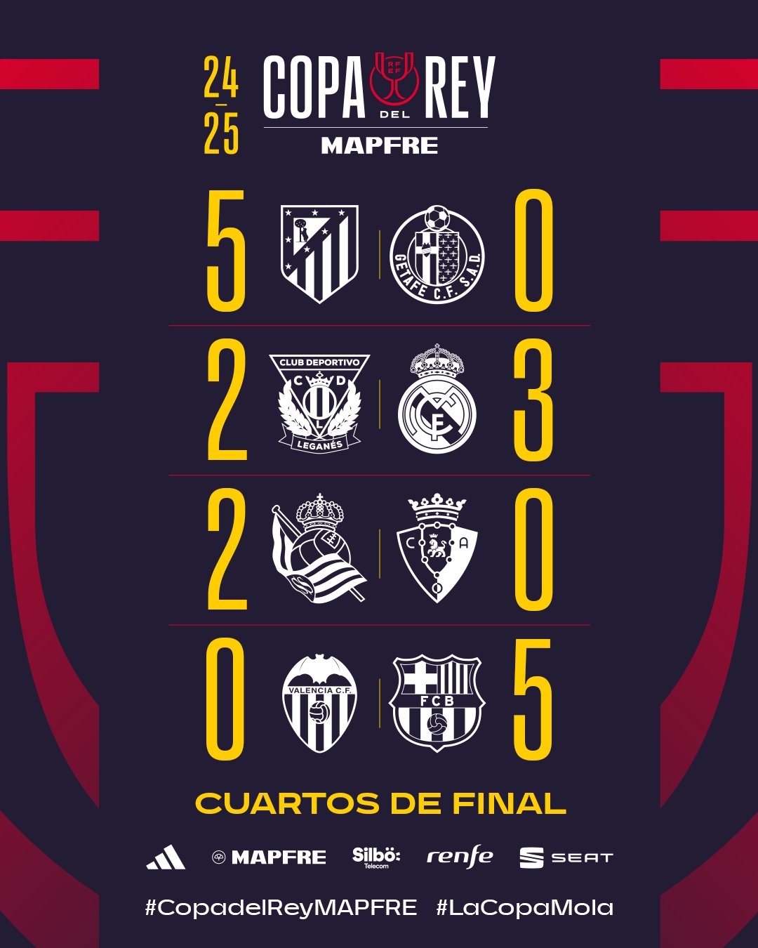 02月07日讯 今日凌晨国王杯8强赛,巴萨5-0大胜瓦伦西亚,与皇马、马竞、皇社共同晋级4强。