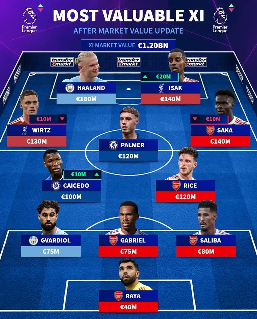 德转列英超最贵11人阵容:哈兰德领衔,7人身价过亿,总价12亿