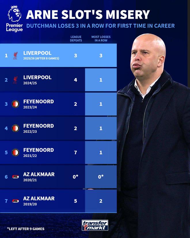 雷速体育10月20日讯 英超第8轮焦点战,利物浦主场1-2不敌曼联,遭遇联赛三连败。据德转统计,这是斯洛特在联赛执教生涯中,首次遭遇三连败。